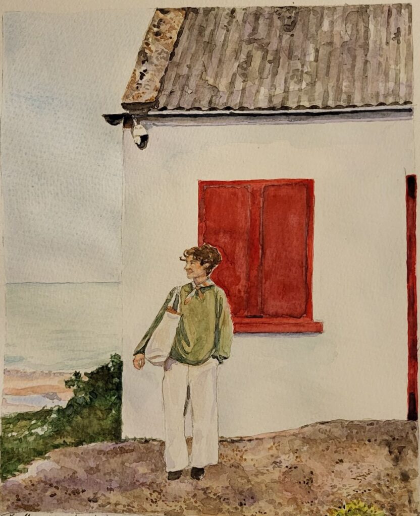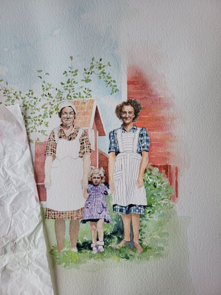 Jag har gjort en liten akvarell, mest på kul, för att inte ”glömma bort” hur man gör. Det är en målning utifrån ett foto av en person som delar sitt liv i sociala medier. Personen inspirerar mig på sättet hon valt att leva ett enklare liv, småskaligt, återbruk, secondhand och att odla och laga det hon och familjen äter. Vi fick kontakt och hon tyckte att det skulle vara kul att få se akvarellen. Nu är den klar och jag ska skicka den till henne i veckan som kommer (som ett tack för att hon får mig att le!)