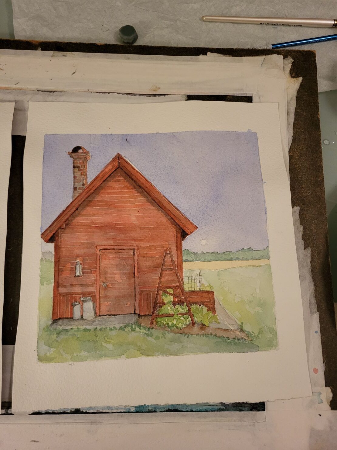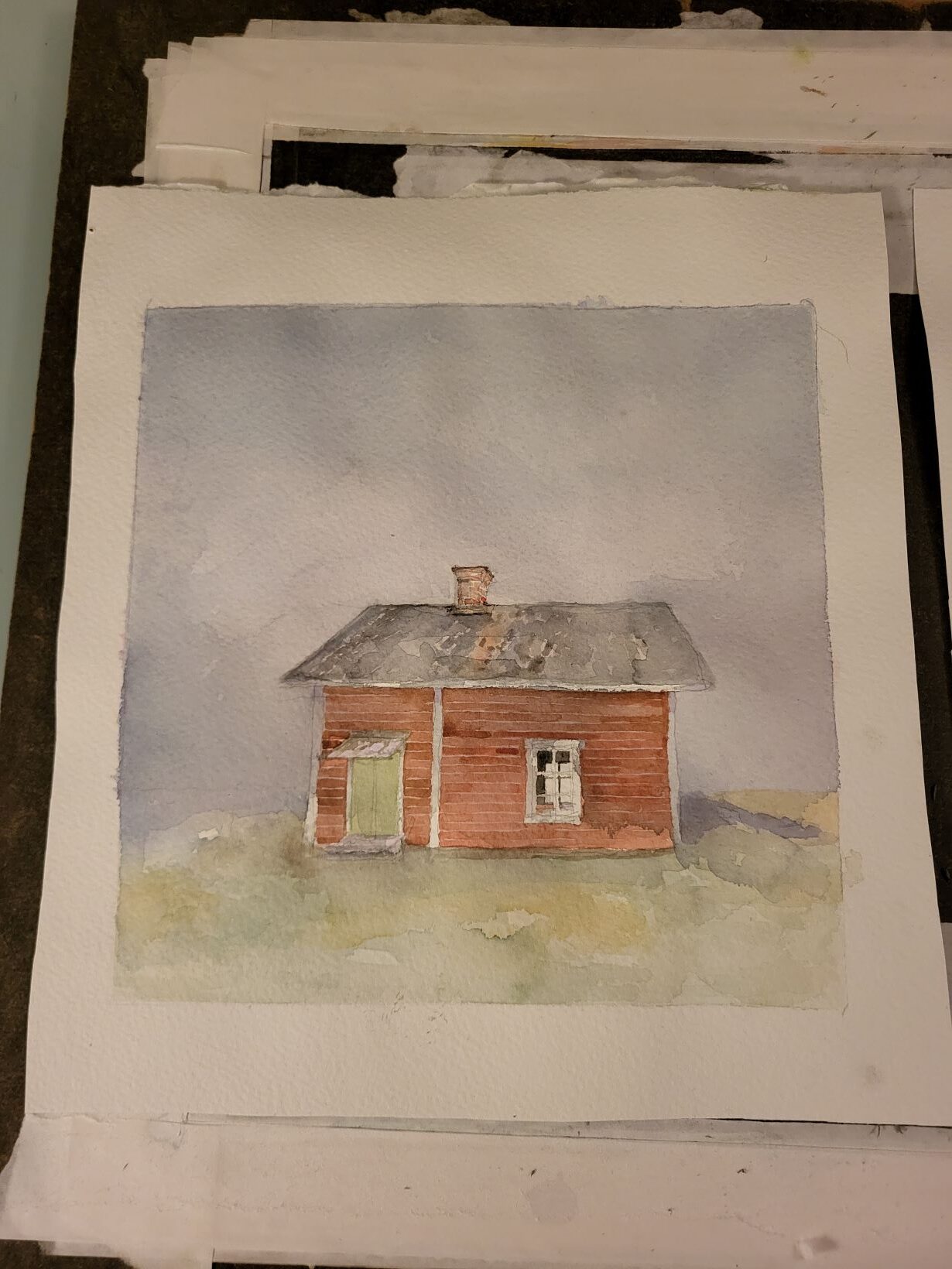 För att ha lite olika bilder att växla mellan medans jag väntar på att färger torkar påbörjade jag ett par mindre akvareller. Har tänkt måla fler exemplar av byggnader på gården och i byn så det fick bli en akvarell av byskolan i dimma och vår lilla gulliga tvättstuga som användes som tvättstuga och sommarkök i början av 1900-talet. Jag märker hur jag saknat att få sitta ner vid bordet med färger och penslar. Måste försöka prioritera måleriet.