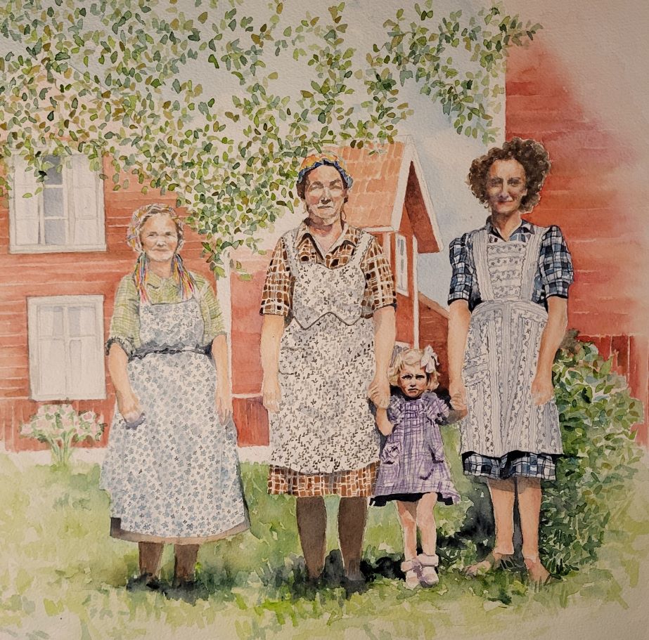 Även om det ofta var svårt att få livet att gå ihop och att det fanns tysta konflikter, som ibland la extra tyngd på axlarna, tror jag att gemenskapen gav mycket glädje och styrka i att fortsätta kämpa tillsammans. En stor kram från mormor och gammelmoster, kanske en karamell från någon långväga släkting var lyckan i den lilla världen. De som gick före ger mig stor inspiration i mitt måleri och i mitt liv. Glad att jag haft dem vid min sida. Framöver kommer du att få möta dem igen i mina målningar. Kanske kommer du att bli påmind om dina egna släktningar och minnas härliga stunder i ditt liv.